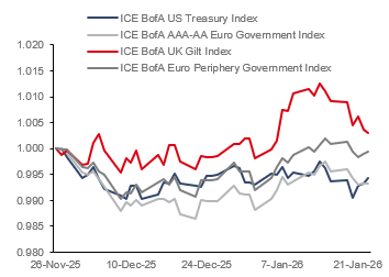 • While we remain positive on global and US stocks and continue to position in Asia for geographical diversification, we have adjusted our equity allocation by upgrading Materials across regions and underweighting Europe ex-UK stocks after taking profits on European peripheral markets. UK Gilts have performed well since the Autumn Budget and benefit from favourable tailwinds, supporting our upgrade to overweight, and aligning with our investment grade credit positioning. We also upgrade Japanese government bonds to neutral following the recent sell-off.