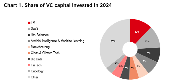 Our analysis of the VC market shows that climate and clean tech represents 5% of VC capital invested in 2024, ranking as the 6th largest category after technology, media and technology (TMT), Software as a Service (SaaS) and AI (Chart 1). When we consider VC deal volume, climate and clean tech climbs up the rankings, representing 7% and the third largest segment. This suggests that, while overall capital invested is comparatively lower, the sector is experiencing a higher number of transactions within the broader VC market (Chart 2).