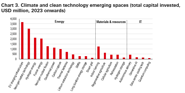 In the VC market, emerging spaces refer to industry verticals within a sector characterised by early-stage investment and technological development. These areas are poised to attract further capital and drive innovation in the climate and clean tech spaces. Chart 3 highlights global emerging spaces within the climate and clean tech category from 2023 onwards. Key to the net zero transition, these technologies provide applications across renewables, industry, nature and efficiency to drive decarbonisation and inclusive resilience.
