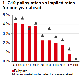 In March, many central banks chose to hold rates steady to manage heightened geopolitical uncertainty, including the Bank of Canada, the Federal Reserve (Fed), the Bank of Japan, the Swiss National Bank, the Bank of England (BoE), and the European Central Bank. Market pricing suggests that, aside from the Fed, most other G10 central banks are likely to raise rates over the next 12 months (Chart 1)