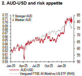 Looking ahead, the AUD is likely to remain sensitive to shifts in global risk sentiment over the near term (Chart 2). The AUD may struggle to outpace the USD, but it is likely to outpace the NZD, given Australia’s strong domestic fundamentals, including a hawkish RBA stance, commodity exposure, a modest current account deficit financed largely through foreign direct investment (FDI) and portfolio inflows, and a comparatively low debt-to-GDP ratio vs other G10 economies.