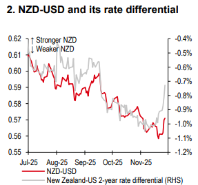 On 26 November, the Reserve Bank of New Zealand (RBNZ) cut its policy rate by 25bp to 2.25%, as widely expected. The central bank’s policy rate projection indicates a minimal additional reduction of 5bp, with the lowest rate expected by June 2026. Governor Hawkesby noted that this aligns with the rate remaining stable in 2026. The RBNZ emphasised that the significant 325bp reduction since August 2024 is bolstering demand, and the unemployment rate has peaked. Following this announcement, NZD-USD jumped, driven by rate dynamics (Chart 2).