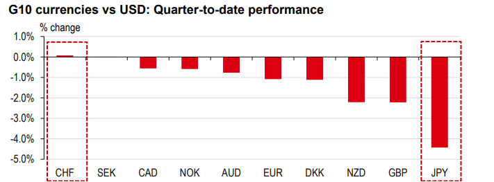 In this fourth quarter, the CHF leads as the top-performing G10 currency, with the USD close behind. In contrast, the JPY, another “safe haven” currency, is the weakest. This disparity prompts questions about the reasons for their varied performances and the potential persistence of this trend.