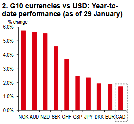 Year-to-date, the USD has been the weakest G10 currency, with the CAD close behind (Bloomberg, 29 January). While the CAD has strengthened against the USD − reflecting movements in the broader USD Index and a reduction in net short positions (Chart 1) − it remains the laggard within the G10 group (Chart 2). This is mainly due to uncertainty around US-Canada trade relations, especially the upcoming US-Mexico-Canada Agreement (USMCA) review.