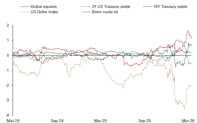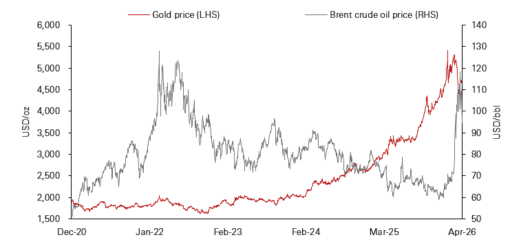 High real yields can be a headwind for gold as it offers no yield. Long-end rates have mattered more since the conflict began, as they have moved alongside a stronger US dollar, weaker equities, and higher oil prices. Although we still expect Fed policy rates to remain unchanged through 2026 and 2027, which could limit gold’s upside, stagflation risks should continue to support demand for gold.