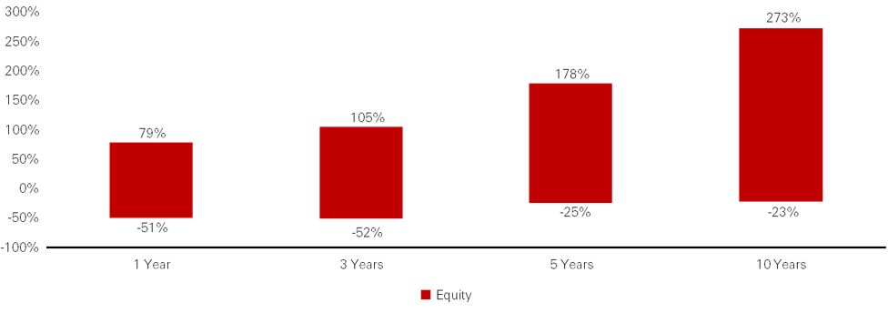 For example, the left bar shows that the performance of global equities over any 1-year period between 1999 and 2024 ranged between -51% and 79%. For any 10-year period, the returns ranged between -23% and 273%.
