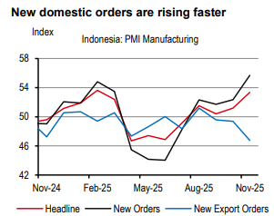 Having said that, the recent policy softening is clear. Bank Indonesia’s (BI) policy rate has been cut by 150bp in this cycle, and a string of fiscal stimuli have been announced through 2025. Indeed, recent data shows that domestic demand has started to improve. The latest PMI details show that new domestic orders are growing faster, even though new export orders are not. Other indicators, like consumer sentiment and truck sales, also point towards an improvement in activity.