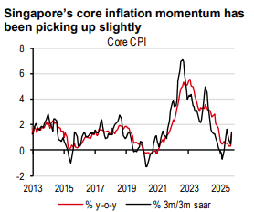 In addition, inflation has finally picked up. After being subdued at 0.5% on average in the first nine months of 2025, core inflation rose 1.2% y-o-y in October, though in part due to base effects. We expect core inflation to grow beyond 1% y-o-y from 4Q25. Overall, we recently revised upward our core inflation forecast slightly to 0.7% (from 0.6%) for 2025 and to 1.3% (from 0.9%) for 2026. While a low-inflation environment opens the door for the Monetary Authority of Singapore (MAS) to ease again, we expect the MAS to stay put through our forecast horizon. The MAS’ primary focus is no doubt growth, but fiscal policy should take the lead in prompting growth if headwinds materialise.
