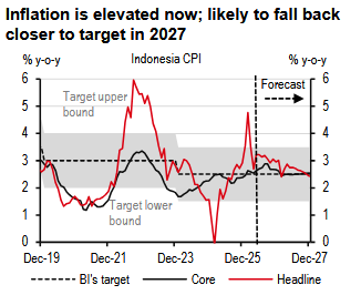The Middle East tension is only exacerbating the situation. Indonesia’s net oil imports may be lower than the region’s (1.4% of GDP versus the 3% regional average), but so are its strategic domestic reserves (at 20-25 days of oil supply). A spike in prices can widen the current account deficit, stoke inflation, and hurt growth. The impact on inflation can be lower if the government subsidises oil prices for consumers. Still, cuts may have to be made in other areas to ensure that the deficit doesn’t rise too much. Meanwhile, higher oil prices could widen the current account deficit, keeping the currency volatile, and coming in the way of rate easing. We recently lowered our GDP growth forecast for the year to 4.7% (from 5.2%), which assumes oil prices to average USD80/b in 2026.
