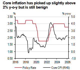 Elsewhere, inflation has largely remained benign, even though core inflation has picked up slightly to above 2% y-o-y. That said, there are still upside risks to inflation from the uncertain fate of subsidies for RON95 petrol. Overall, we have recently upgraded our headline inflation forecast to 2.1%, from 1.7%, for 2026. But we do not believe price pressures are significant enough to prompt Bank Negara Malaysia (BNM) to hike anytime soon.