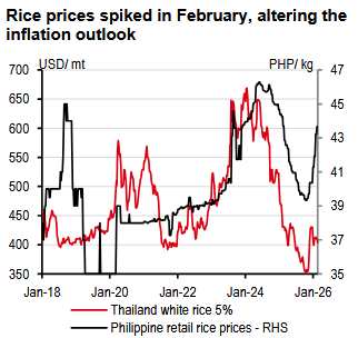 Headline inflation has finally returned to within the Bangko Sentral ng Pilipinas’ (BSP) 2-4% target band in February after 10 months of floating below it. But the inflation outlook turned grim when retail rice prices jumped by c10% since December. With rice being the heaviest component in the CPI basket, this jump in prices, if sustained, could increase inflation by 0.9ppt.