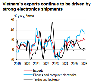 Although Vietnam was widely expected to be one of the economies with high US tariff risks, its trade was not disrupted but instead ballooned to a record high. Its trade surplus also remained sizeable. Despite facing a 20% headline tariff from the US, Vietnam captured even more market share for certain goods, such as footwear, textiles and consumer electronics. The positive trade momentum has been sustained in 2026, with exports growing 18% y-o-y in the first two months.