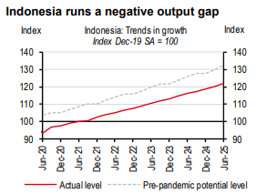 Indonesia’s post-pandemic GDP growth has been weak. Despite higher-than-expected 2Q25 GDP growth of 5.1%, we estimate that GDP is still c7.5% below its pre-pandemic trend. The highfrequency indicators like manufacturing PMI, credit, and consumer sentiment also point to softness.
