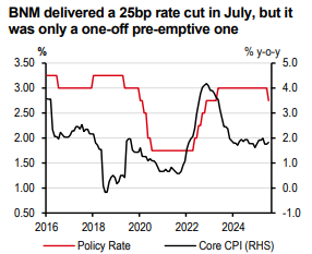 In addition, inflation remains well behaved, as headline CPI decelerated to 1.4% y-o-y y-t-d as of July. Given subdued inflation momentum, we recently lowered our headline inflation forecast to 1.5% (from 1.9%) for 2025 but kept our 2026 forecast at 1.7%.