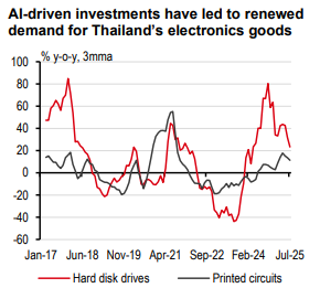 Key here to understand is that not all the surge in exports is due to frontloading demand. Thailand’s supply chains for printed circuit boards and Hard Disk Drives (HDDs) run deep, with Thailand being the second largest exporter of HDDs globally. And the boom in AI-related investments has brought renewed demand for both. HDD exports, in particular, have grown c50% y-o-y on average over the past 12 months, representing a rejuvenation of a technology that was once thought to be outdated.
