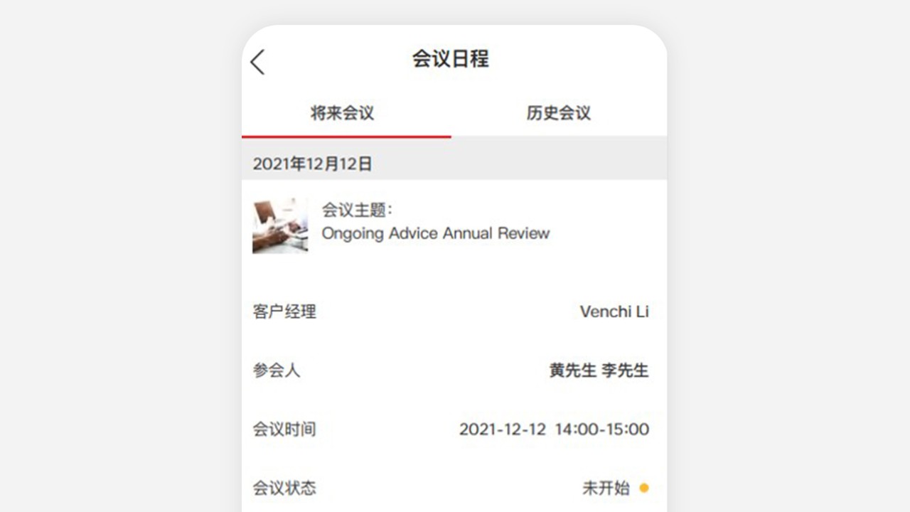 预约成功后,客户经理将向您发送会议邀请。您可通过汇丰中国手机银行APP财富管理页面的 “财富视频通”,查看视频会议的相关信息。