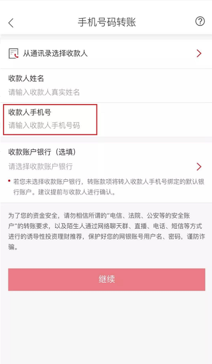 无论您是付款还是收款,只要收款方在开户银行端将手机号与银行账号绑定,就可以直接输入收款方姓名与手机号轻松完成转账,无需输入银行账号了!