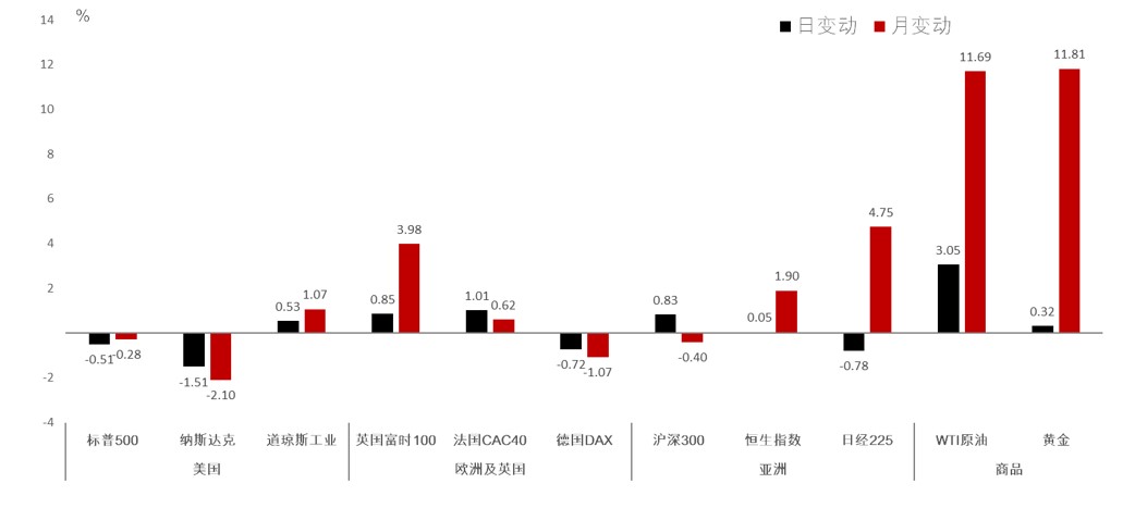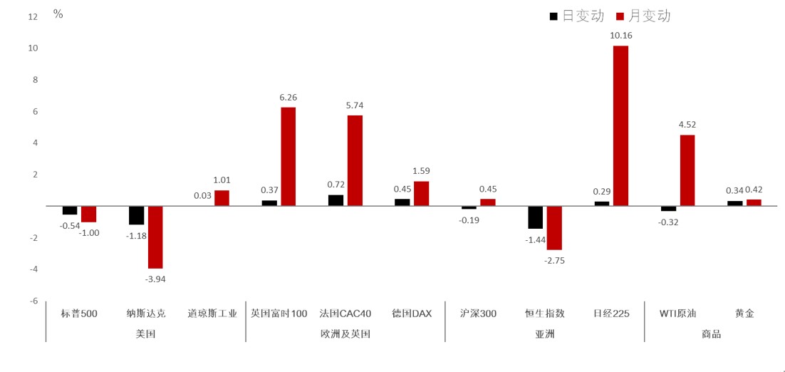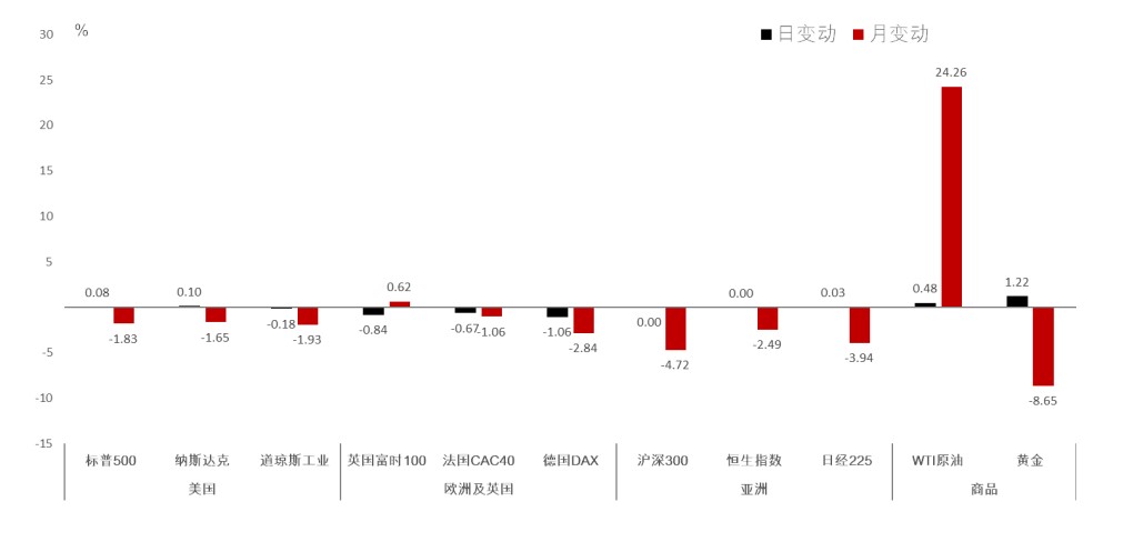 数据来源:万得,汇丰私人银行,截至前一个交易日收盘,过去数据不代表未来表现。WTI指西德州中级原油。法国CAC40指数指巴黎券商公会指数;德国DAX指数指法兰克福指数。
