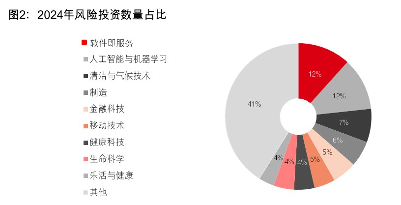 我们对风险投资市场的分析显示:2024 年气候和清洁技术投资占风险投资总额的 5%,位列第六大投资类别,排在科技、媒体和电信(TMT)、软件即服务(SaaS)及人工智能之后(见图 1)。若以风险投资交易数量衡量,气候和清洁技术领域的排名则跃升至第三位,占比达 7%。这表明,尽管该领域获得的投资总额相对较低,但在整体风险投资市场中的交易活跃度更高(见图 2)。
