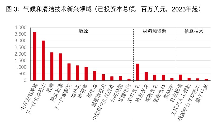 在风险投资市场中,“新兴领域”指的是某一行业内以早期投资和技术开发为特征的垂直领域。这些领域有望吸引更多资本,并推动气候和清洁技术领域创新。图 3 重点展示了自 2023 年以来,全球气候和清洁技术类别中的新兴领域。这些技术是实现净零排放转型的关键,它们被应用于可再生能源、工业、自然生态和能效提升等方面,旨在推动脱碳进程并提升包容韧性。