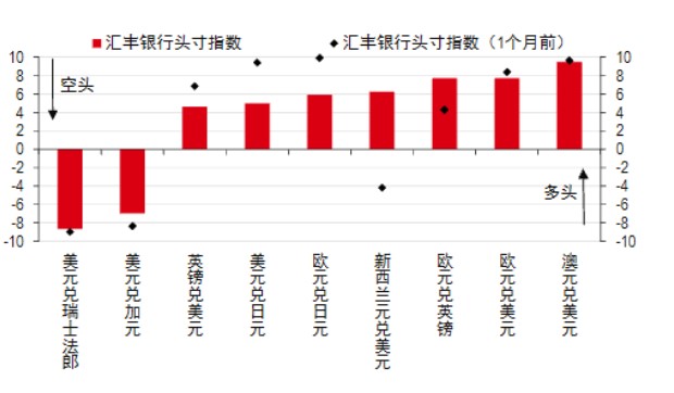 汇丰银行头寸指数:旨在通过观察多个不同时间期限的数百种不同交易策略,追踪趋势交易者的净头寸。该指数考虑的时间期限为5天到260天。如果指数为+10,则表明数百个不同策略都开始做多(即买入货币对的第一种货币)。同样,指数为-10表明所有策略都在做空(即卖出该货币对中的第一种货币)。