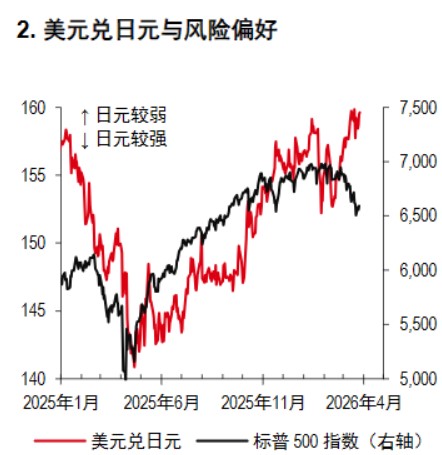 近期日元走弱不难理解,这反映出能源价格上涨对贸易条件的冲击,以及日本庞大的石油和天然气贸易净逆差(2025 年约占国内生产总值的 2.7%)。然而,更大的风险在于日元的行为发生改变(图 2)。如果全球金融状况突然收紧,再加上股市波动加剧和美债收益率下降,就有可能出现这种情况。历史经验表明,在此类情形下,美元兑日元在多数时候下跌(根据我们的分析,自 2006 年以来,按周观测的数据显示该货币对下跌占比达 85%)。