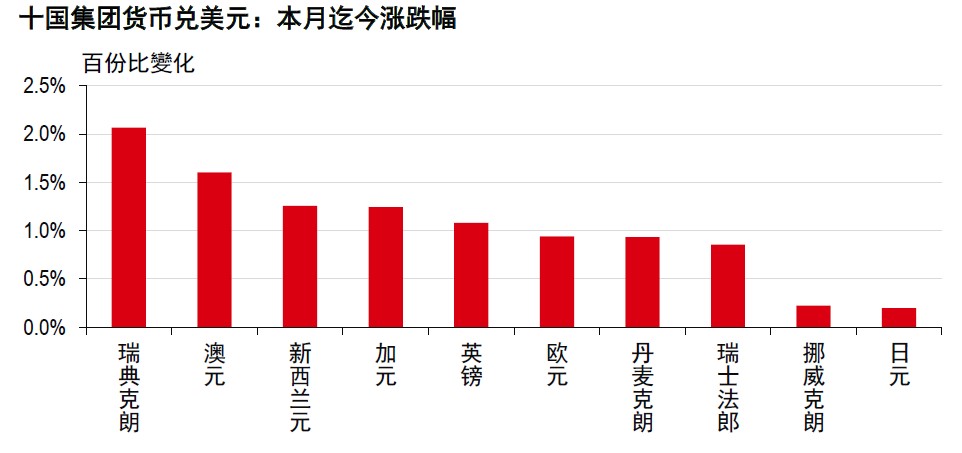 进入 12 月以来,瑞典克朗领跑十国集团货币,澳元、新西兰元及加元紧随其后(详见下图)。这一趋势反映出美元兑十国集团货币普跌(请参见《外汇前瞻快讯:美元:美联储第三次降息 25 基点,并提供中性指引》了解详情)。