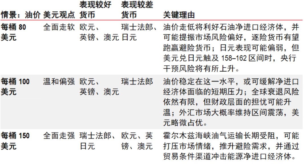 中东地缘政治仍是外汇市场的主要驱动因素。然而,相关消息面较难解读,原因在于地区紧张局势可能会迅速升级或缓和。我们认为,市场走向可能取决于几项实际指标,尤其是霍尔木兹海峡航运受阻的程度,以及由此引发的油价走势。随着地缘政治风险跌宕起伏,油价可能出现剧烈波动,推动市场情绪在“避险”与“逐险”之间反复切换。下表汇总了三种油价情景下八国集团货币的潜在表现。