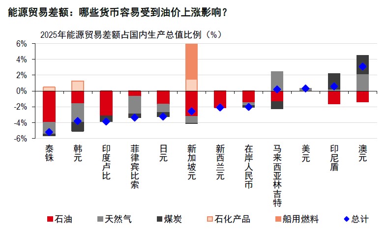 最终,油价走势将在决定汇率走向方面发挥关键作用。霍尔木兹海峡(the Strait ofHormuz)是一个关键敏感点,承担着全球19%的石油运输量。任何中断都可能对外汇市场产生重大影响,尤其是主要石油净进口国的货币(如下图所示)。相反,地缘政治紧张局势的缓和可能会导致美元回吐近期涨幅,因为支撑美元走软的基本因素并未改变。