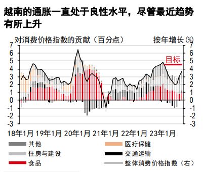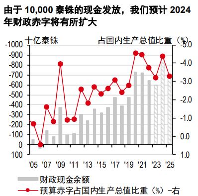 然而,我们预计 2024 全年增速仍将保持在 4.2%的强劲水平。为期 4 个月的政治僵局终于结束,新当选的总理赛塔·他威信(Srettha Thavisin)已经制定直到 2024 年下半年的经济计划。他的经济蓝图的核心是向所有 16 岁及以上的泰国公民发放 10,000 泰铢的数字现金,希望以此提振泰国的消费,这一预期受到家庭债务高企和人口老龄化的挑战。但这样做的代价很高。当局表示,该项目将耗资 5,600 亿泰铢,占国内生产总值的 3.0%。如此大规模的财政刺激计划可能不仅会促进增长,还会引发通胀担忧。