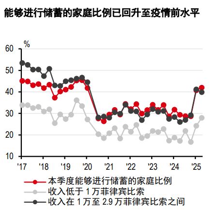 随着通胀最终得到控制,家庭的购买力得以保持。因此,作为经济主要引擎的私人消费已连续两个季度加速增长。并且,尽管消费增加,家庭(尤其是低收入和中等收入家庭)最终能够进行储蓄。事实上,菲律宾央行数据显示,2025年第二季,月收入低于500美元的家庭中能够进行储蓄的比例已几乎回到疫情前水平。这推动国民储蓄率上升到足以在该季度弥补菲律宾的储蓄-投资缺口的程度,使得菲律宾在为经常项目逆差融资时,对外国资本的依赖下降。
