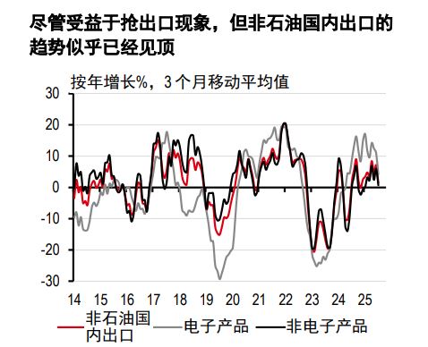 毫无疑问,前置效应十分明显。制造业支柱按年强劲增长超过10%,反映了生产商和出口商在2025年第二季急于争相向美国出口。这也体现在创纪录的季度出口数据中,2025年第二季出口按年增长超过18%。