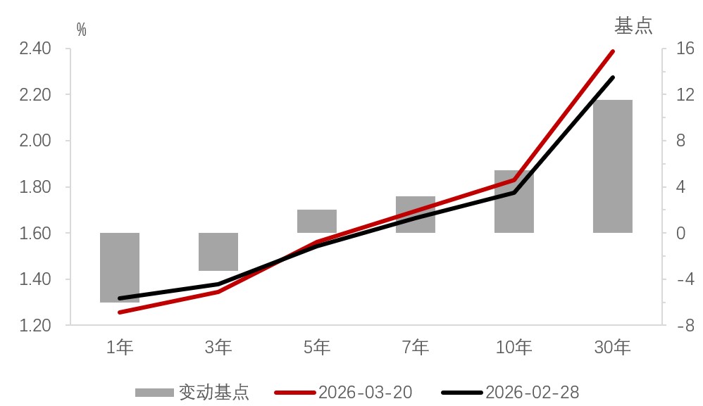 3月中国债券市场迎来挑战,多空因素交织下市场震荡加剧。收益率呈现鲜明的期限分化格局,截至3月20日,10年期国债收益率再度回升至1.83%附近,较2月末上行约5个基点;30年期国债收益率进一步升至2.38%左右,上行幅度超过11个基点。与此形成对比的是,1年期国债收益率在避险情绪和资金面稳健的作用下,下行6个基点至1.28%下方,收益率曲线整体趋于陡峭化。信用债表现与利率债相似,中短端表现更为占优,长端则同样面临调整压力。